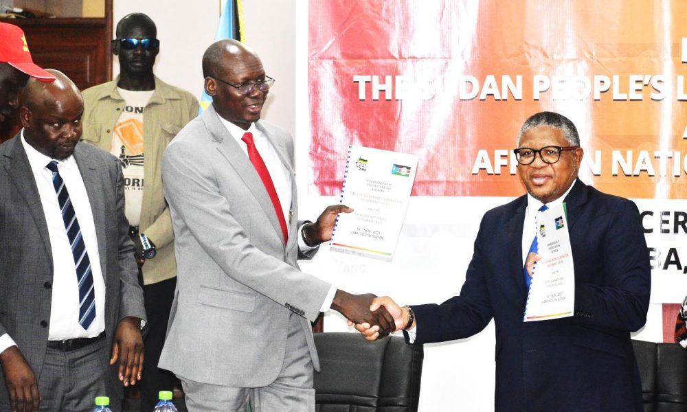 SPLM secretary-general, Peter Lam Both, and his South African counterpart, Fikile Mbalula signed the agreement at the SPLM House in Juba on behalf of the chairpersons of their respective political parties.